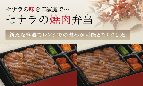大人気、セナラの焼肉弁当。セナラの味をご家庭でどうぞ。※お受け渡しは店頭のみ