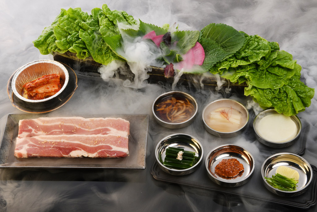 厳選した国産豚を香ばしく焼き上げ。彩り野菜と一緒に、6種類の薬味を包んでお召し上がりください。 美味しい食べ方➣豚バラを焼き上げたら、まずサムギョプサル専用タレにつけサンチュ➣豚バラ➣甘酢大根➣葱➣サンチュ味噌の順番にのせ包んでお召し上がりください。その他焼キムチ・唐辛子などはお好みで足し包んでください。