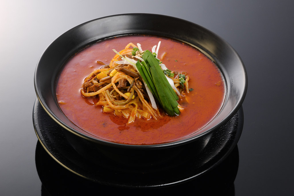 北海道産小麦100%使用の拘り平打ち麺。牛肉と野菜を醤油ベースの薬味で炒め、香りを立たせた辛口ラーメン。