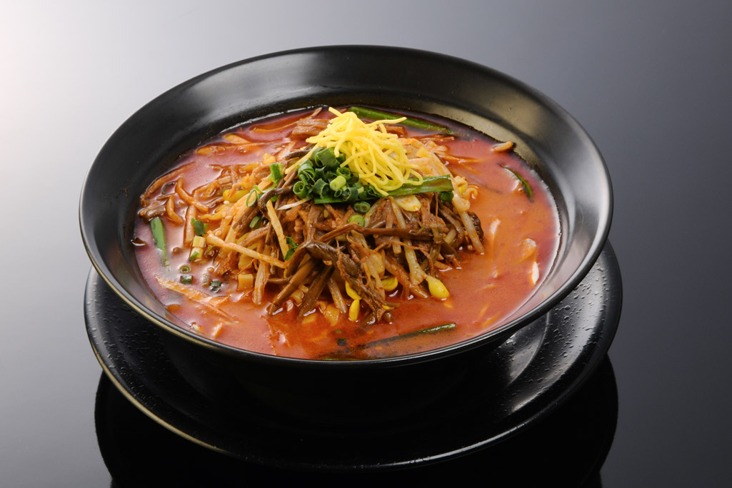 北海道産小麦100%使用の拘り平打ち麺。牛肉と野菜を炒め、コクを出し、牛骨のブイヨンで仕上げた辛口ラーメン。