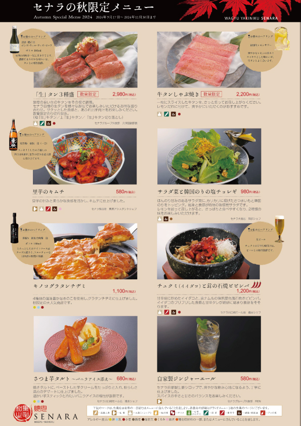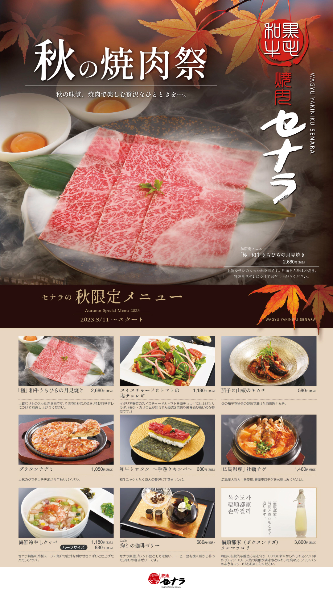 旬の食材を活かしたメニューや、秋限定の人気メニューのリバイバルなど、 秋の味覚と焼肉を存分に楽しめるラインナップとなっております。