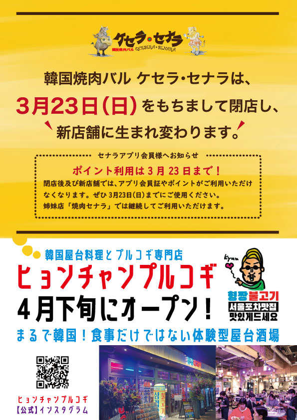 この度、姉妹店「韓国焼肉バル ケセラ・セナラ」は 2025年3月23日(日) をもちまして閉店し、新店舗に生まれ変わります。